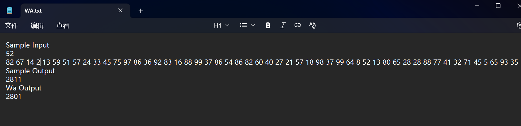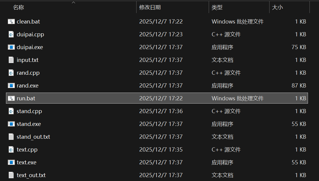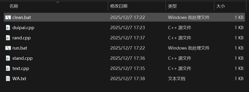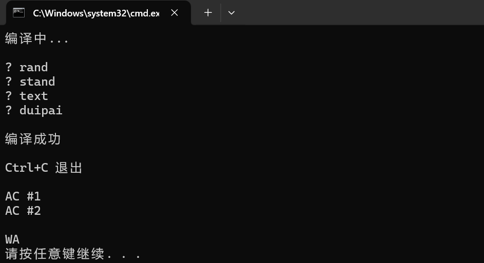 int main() {int test_case = 1;while (true) {//生成随机数据system("rand.exe > input.txt");//stand.cpp和text.cpp分别处理数据system("stand.exe < input.txt > stand_out.txt");system("text.exe < input.txt > text_out.txt");//比较输出if (!compareFiles("stand_out.txt", "text_out.txt")) {cout << "\nWA\n";break;}cout << "AC #" << test_case << endl;test_case++;}return 0;