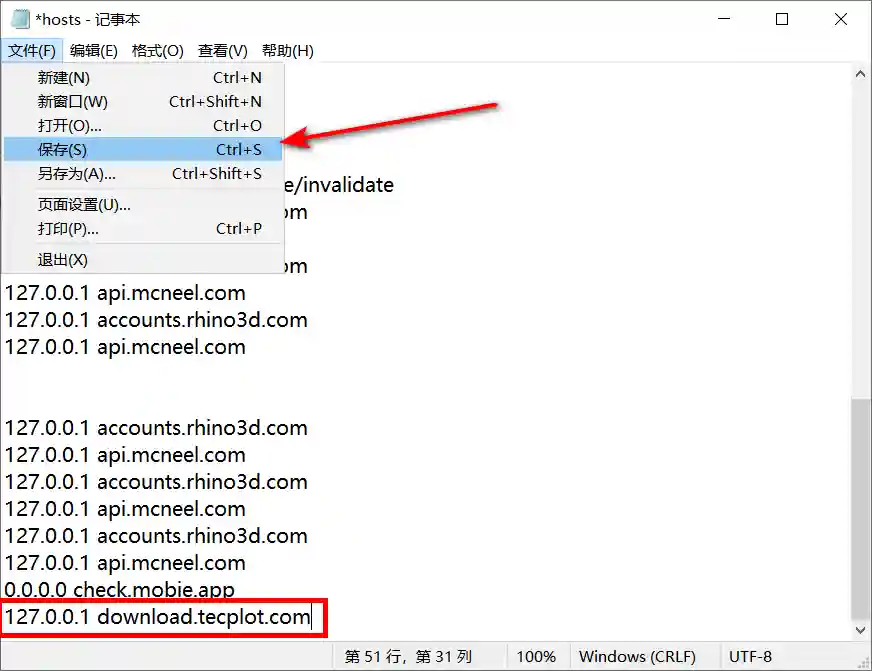 17、在文档最后添加代码【127.0.0.1 download.tecplot.com】并保存 然后关闭