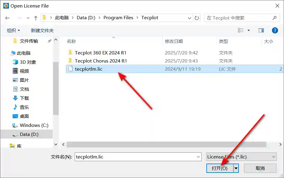 20、选择解压后的文件夹中Crack下的【tecplotlm.lic】文件,点击【打开】