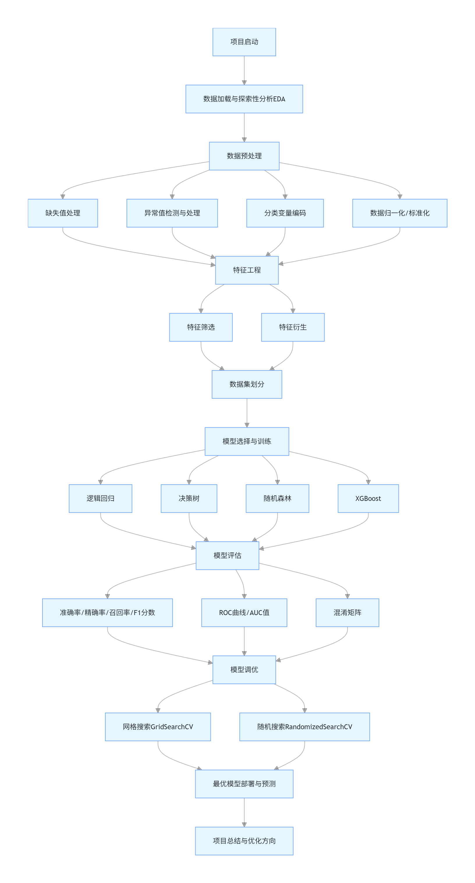 graph TDA[项目启动] --> B[数据加载与探索性分析EDA]B --> C[数据预处理]C --> C1[缺失值处理]C --> C2[异常值检测与处理]C --> C3[分类变量编码]C --> C4[数据归一化/标准化]C1 --> D[特征工程]C2 --> DC3 --> DC4 --> DD --> D1[特征筛选]D --> D2[特征衍生]D1 --> E[数据集划分]D2 --> EE --> F[模型选择与训练]F --> F1[逻辑回归]F --> F2[决策树]F --> F3[随机森林]F --> F4[XGBoost]F1 --> G[模型评估]F2 --> GF3 --> GF4 --> GG --> G1[准确率/精确率/召回率/F1分数]G --> G2[ROC曲线/AUC值]G --> G3[混淆矩阵]G1 --> H[模型调优]G2 --> HG3 --> HH --> H1[网格搜索GridSearchCV]H --> H2[随机搜索RandomizedSearchCV]H1 --> I[最优模型部署与预测]H2 --> II --> J[项目总结与优化方向]
